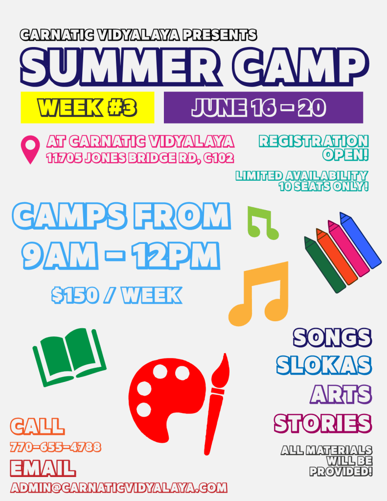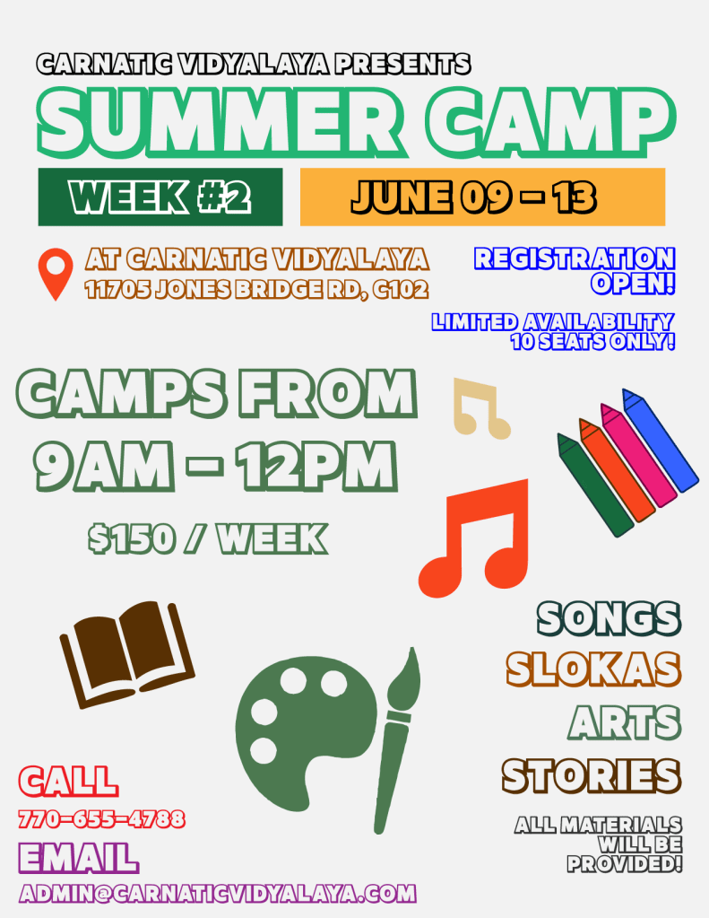 Discover the joy of music, tradition, and fun this summer! Our week-long camp is perfect for children who want to explore the beautiful world of Carnatic music and slokas in a playful and engaging environment.